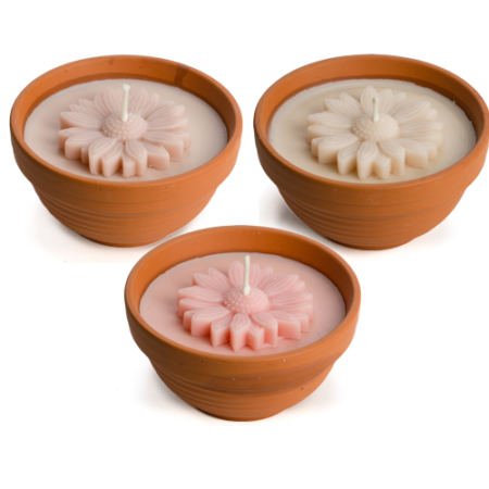 De terracotta potjes met vrolijke bloemkaars zijn voor binnengebruik.